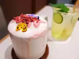 My mother chose a beautiful Sakura Cotton Candy Bubble Bath🌸, topped with large cotton candy and dried strawberries🍓, with milk underneath.