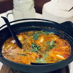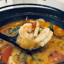Tonkatsu soup is the most famous soup in Thailand, also meaning sour and spicy, tom yum refers to sour and spicy, kung refers to shrimp, here done very well, moderate sour and spicy, full of Thai spice flavor, and full of soup ingredients, shrimp, squid, mussels, mushrooms, good drink and delicious