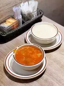 The creamy soup is thick and smooth, with a few corn kernels; the borscht is tangy and sweet, not spicy at all, made with various vegetables.