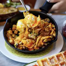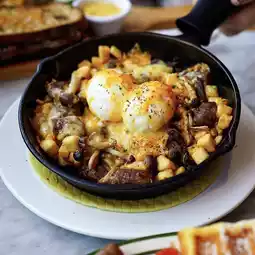 Beef cubes, mushrooms, two pop-up poached eggs, cheese composition~