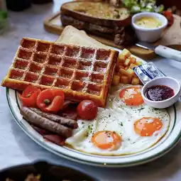 Served with 3 sun eggs🥚 sausage, bacon, salmon, toast, waffles,