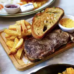 Using sweet rye bread, served with 5 ounce ribeye steak, caramelized onions and sour cream.