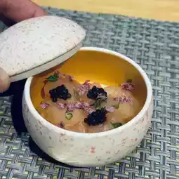 π¦ Japanese Corn Puree, Sweet Shrimp, Black Fish Roe - Served with shrimp head, shrimp roe, and shrimp oil sauce. The corn puree is currently in season in Japan, very sweet and pairs well with the crunchy sweet shrimp and other fresh ingredients.
