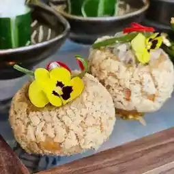 Tender and bouncy lobster meat is mixed with mentaiko puree, crab seeds and greenhouse cucumber pieces to form a filling, sandwiched with a flower-shaped crispy toast