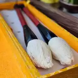 Purple sweet potato puree is wrapped in pastry into a "brush head" shape, which contains marshmallows, which are crispy and smoky. The pastry is stuck to the brush tube with white chocolate. Then dipped in "ink" is actually black molasses, which makes the taste layered 👍