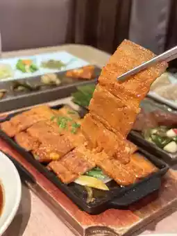 Korean spicy sauce pork belly is slightly spicy and less sweet, with distinct layers of fat and lean meat. The fat is oily and flavorful, while the lean meat is chewy and tasty. Wrapping it in vegetables and eating it can reduce the greasiness.