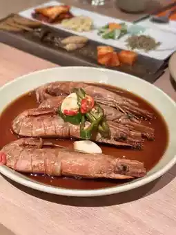 The two different seafoods have their own characteristics. Also marinated in soy sauce, the scallops are large and have a very rich, fresh, chewy, and slightly sweet taste. The raw shrimp heads are very oily and the shrimp meat is soft and smooth.