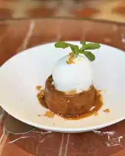 The dessert is quite surprising, with a scoop of coconut ice cream on top and a cake pudding soaked in date caramel below. It's definitely sweet and pairs perfectly with coffee!