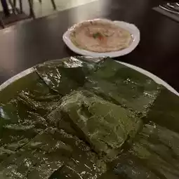 This fish dish is unique to East India. The fish Kujit is wrapped in banana leaves and served with Indian pancake Uttapam. The dark green fish meat is tender and juicy, it is definitely a unique fish dish in India~