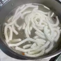 When the heart-shaped noodles are placed in the pot, they expand after a while. The noodles have a coconut fragrance, a chewy texture, and a consistency similar to glutinous rice.