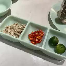 They used Hainan Wenchang chicken, which had a distinct chicken flavor and a firmer texture. Besides eating the chicken pieces as they are, you can also mix the three sauces—sand ginger, chili, and calamansi—for a sweet, sour, and spicy taste, which enhances the flavor.