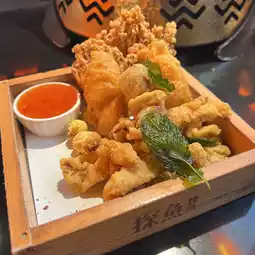 This is a set of fried yam, golden needles, crispy pork and tender fried chicken. Each fried food is fried until golden and crispy, with great color, aroma and taste. The texture is crispy on the outside and tender on the inside.