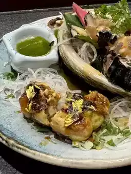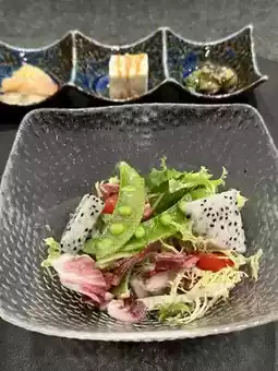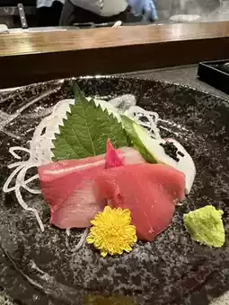 The three appetizers include smoked chicken, mustard octopus and sesame tofu. There are also oily fish, tuna and squid for sashimi.