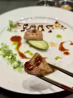 Then came the pan-fried goose liver, drizzled with 18-year-old black vinegar and vanilla sauce. The master specially drew the plate. It's very thoughtful. The goose liver is very fragrant. It's not greasy at all. It's very smooth.
