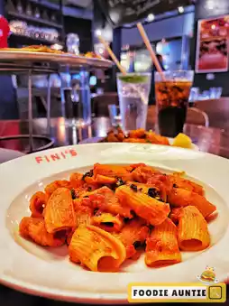 🍝 The pasta here is made with a homemade sauce, the pasta is cooked with elasticity and not too soft, the "Rigatoni Alla Vodka" is made with Fini's secret red sauce, cream, roasted garlic, and Calabrian chili sauce.