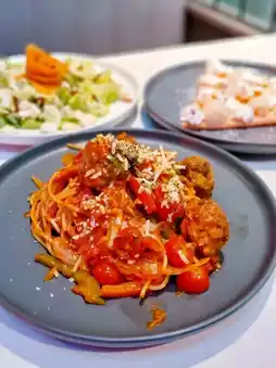 The tomato sauce is spicy and the meatballs are firm and won't fall apart.