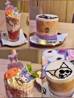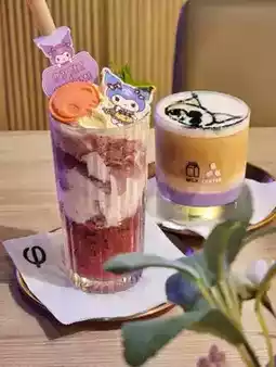 This purple sweet potato coffee has a sweet potato base, a middle layer of fresh milk latte, and a Kuromi design on top. The layered colors are very eye-catching. The sweetness is just right, and the coffee flavor is rich.