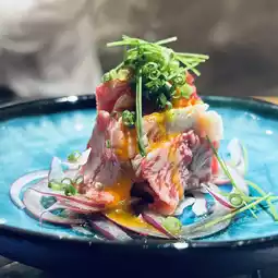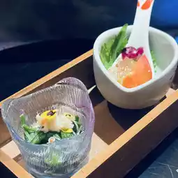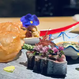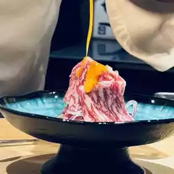 The Wagyu sashimi is marbling with the aroma of beef fat. It's paired with purple onions, Japanese chives, scallions, egg yolk, and sour sauce for a sweet and fragrant flavor that will leave you wanting more.