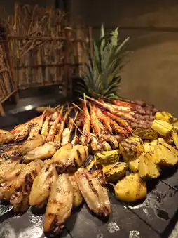 The barbecue items include beef skewers, large shrimp, chicken wings, and our favorite grilled pineapple. The sweetness released from the grilled pineapple is incredibly enticing.