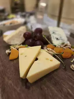 The cheese selection includes both soft and hard cheeses, as well as the strong-flavored blue cheese. A few slices are enough before moving on to desserts.