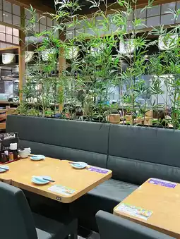 The interior is spacious and comfortable, with a stylish Japanese theme. The minimalist Japanese wooden decor paired with green bamboo leaves creates a relaxing and leisurely atmosphere.
