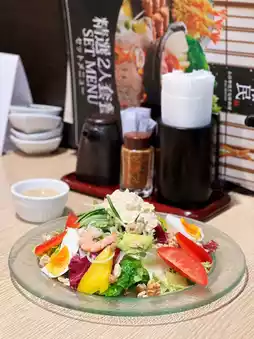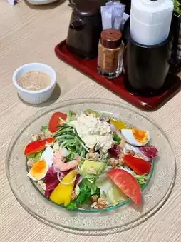 Fresh green salad greens drizzled with thick Japanese sesame dressing, creamy egg salad, smooth avocado, and bouncy fresh shrimp, along with bell peppers, tomatoes, and crispy rice.