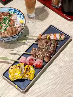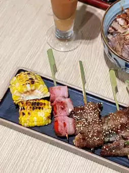The skewers are grilled to order and are not dry at all. The scallion beef roll melts with the sweet aroma of beef fat, balanced by the crispness of the scallions. The enoki mushroom beef roll is crisp with a mushroom aroma. The cherry tomato bacon roll bursts with sweet juice and a hint of bacon oil. The grilled corn is sweet and juicy.