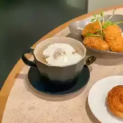 The name of this dish is quite interesting, and it indeed resembles a cappuccino. The mushrooms are blended into a puree, giving it a rich mushroom flavor, with small mushroom bits for texture. A layer of cream is added on top, making it even more fragrant and smooth when stirred together. The soup is served with a Danish roll, a unique pairing.