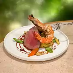 🥩🦐 Pan-Seared Prawns and Beef Tenderloin with Port Wine Sauce $368