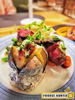 🥩 The menu recommends "Australian 100 Days Grain Fed Black Hair Angus Beef Eye", a full 9 ounces, with stir-fried wild vegetables and smoked meat, and served with sour cream baked potatoes.