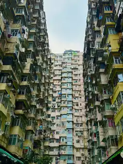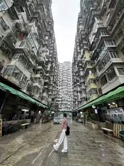 'Yick Cheong Building' is a place where you can fully capture the dense and towering apartment vibe of Hong Kong. The Yick Cheong Building is divided into two parts: the real Yick Cheong Building and the fake Yick Cheong Building. The apartment with the red color in the center is the real Yick Cheong Building. (You can search for Yick Fat Building on Google Maps.)