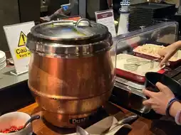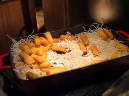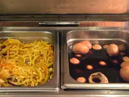 They had drinks including alcohol, salads, bread, hot noodles, boiled eggs, fried udon (or something like it), fried spring rolls, and more.