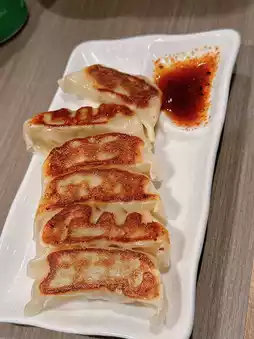 There are six cabbage and pork fried dumplings in a plate. The bottom is fried crispy with gravy. It tastes hot and spicy.