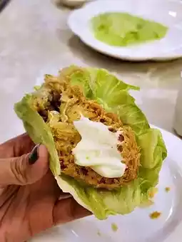 The Tempura Oyster Lettuce Wraps (4 pieces) for $288 feature plump American oysters, fried to a crispy perfection. Paired with salad dressing and wrapped in lettuce, it enhances the flavor significantly.