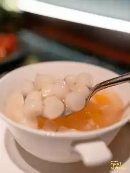 There are many chewy and glutinous meatballs in a bowl. The taste of fermented glutinous rice is very distinct, and it tastes sweet and refreshing. It also has a piece of orange flesh to increase the sourness and is delicious.