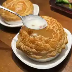 The golden pastry, thin and crispy, is indeed good! Although the cream soup contained several slices of mushrooms, the taste was bland and too thin, which was a bit disappointing.
