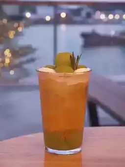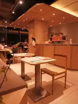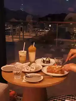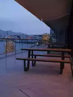 There are outdoor terrace seats with views of the sea, sunset and Chinese pier.