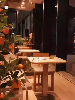 Near the entrance is a silver grass seat for two, and in the atrium there is a fake orange tree.