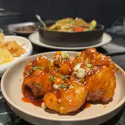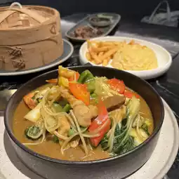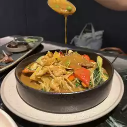 The ingredients are sprouts, cabbage, cabbage, carrots, sweet peppers, chicken balls, and prawns. Rich in palate, slightly spicy and sweet, and moderately thick, the inevitable choice of white rice.