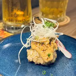 The outer layer of goose liver is crispy, and the taste is sweet and oily. Served with spring onions and shallots, and sushi rice together, it is simply a human delicacy