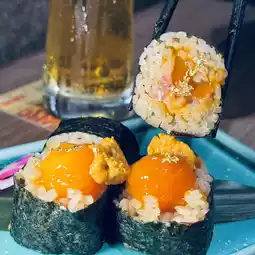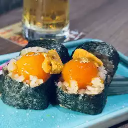 The dragon ball of the roll is the soy sauce marinated egg yolk, served with fish oil-filled tuna puree and seaweed