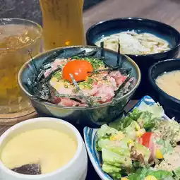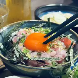 Hearty tuna fillet fish oil, served with scallions and sesame particularly crispy, served with Japanese egg yolk mixed with the most delicious red vinegar rice, very high quality bowl of rice, we chose a set meal, just add $ 45 to enjoy kelp miso soup, sesame garden salad, seafood tea bowl steamed rice, soup udon