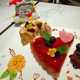 Choose a very luxurious signature dessert platter ❤️ The painting plate is a very cute eight-character cat ✅ Made with heart and sincerity 📍 Four desserts are caramel fig Earl Gray milk cover Basque cheesecake, pistachio milk cover Basque cheesecake, Hokkaido strawberry tart and rich chocolate crispy cake☺️ 🐧 Especially like Basque 😋 The taste is rich and not too greasy, controlled just right 👍, excellent must try