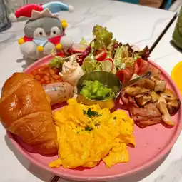 The selected all-day breakfast is beautifully presented ❤️ The content is very rich 😆 There are scrambled eggs, salad vegetables, slow-cooked chicken breast, avocado sauce, German sausage, bacon, butter fried mushrooms, ketchup baked beans and croissants 😋 🐧 I love the big German sausage 👍 eat a bite of meat, salty and delicious ☺️