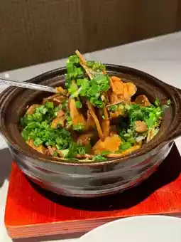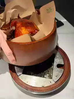 The moment it was served, the aroma of tea filled the air. The chicken was smoked with Longjing tea leaves in a wooden pot. The chicken was golden and crispy, with tender meat, and the skin was thin, so it wasn't too fatty.