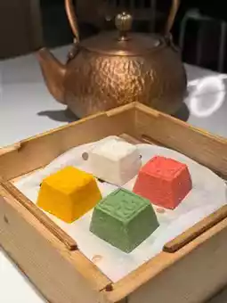 These small, delicate cakes came in four flavors: green tea, custard, red bean, and sesame. They had a pleasant rice fragrance and a chewy texture.