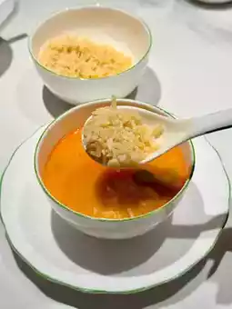 Served piping hot, the orange-yellow shrimp soup was rich and sweet. It contained bits of greens and shrimp. Adding crispy rice before eating gave it a delightful crunch. For $88, the portion and quality were satisfying.