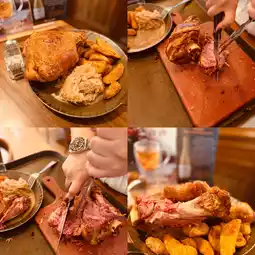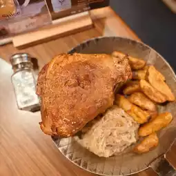 ✨ Crispy skin grilled pork knuckle with sour cabbage and fried potato chips
