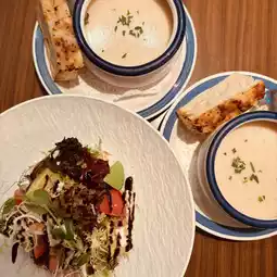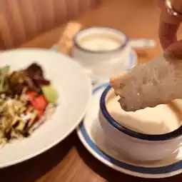 The cauliflower rich soup with homemade French bread is smooth and chewy