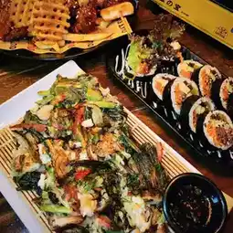 Seaweed rice rolls wrapped in the middle of roast beef, carrot strips, pickled carrots, eggs, cucumbers, etc. You can also eat sesame and seaweed fragrance, with special sauce, sweet and sour, actually quite appetizing ~